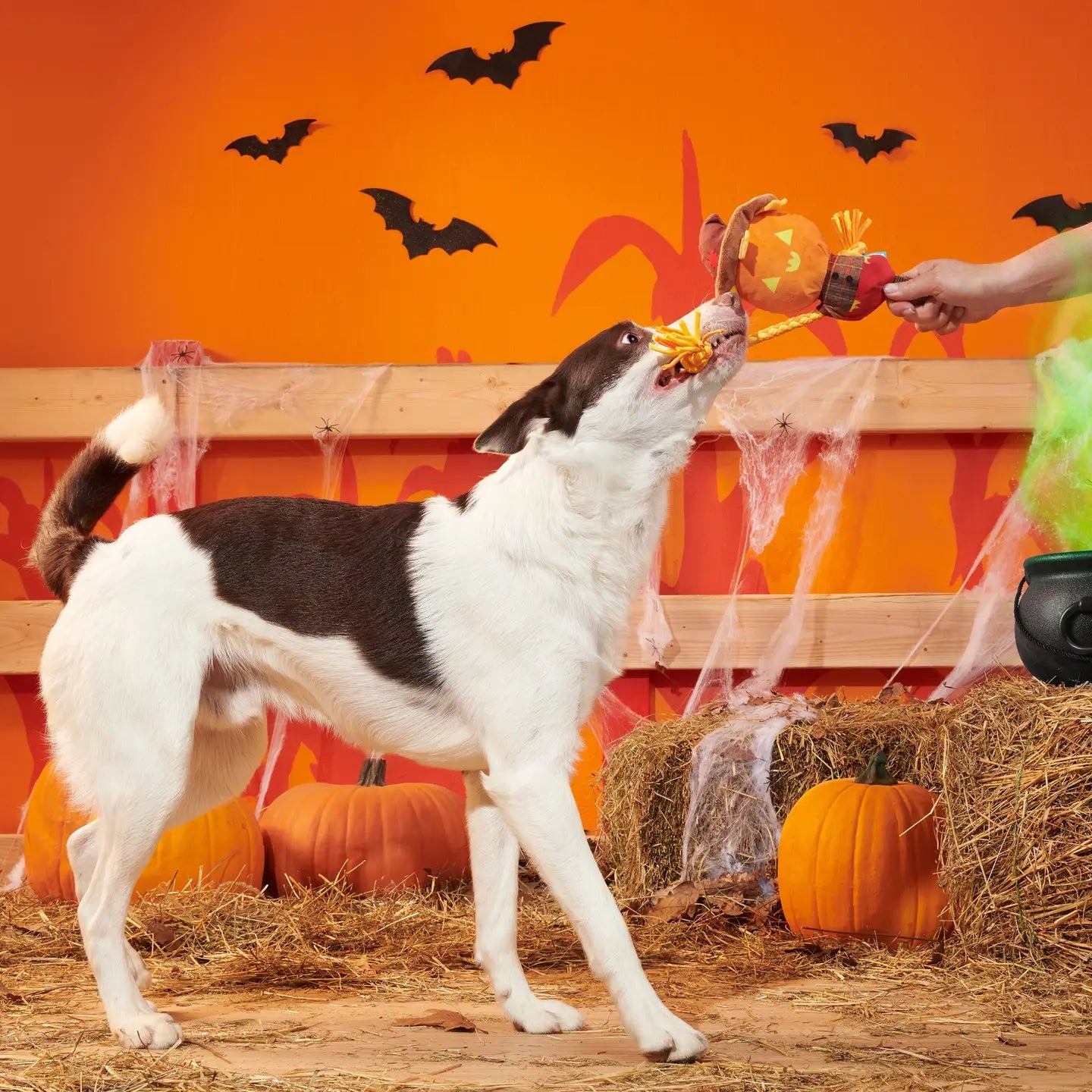 Bring spooky fun to playtime with the Jack-Crow-Lantern Plush Toy! This vibrant scarecrow jack-o-lantern is designed for small to medium dogs and features a pull-through T-shirt rope and a sturdy nylon strap for thrilling tug sessions. Its built-in squeaker keeps pups excited, while the plush, fluff-filled body makes it soft and inviting for cuddles. Perfect for pups up to 50 pounds looking to scare away boredom with every bite and tug!